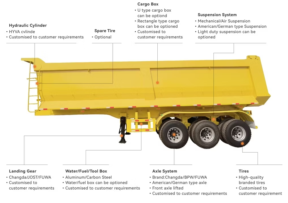 - Featuring a straightforward structure and highly interchangeable components, routine maintenance and part replacement for the tipper semi-trailer are exceptionally straightforward, thereby reducing long-term operational costs.